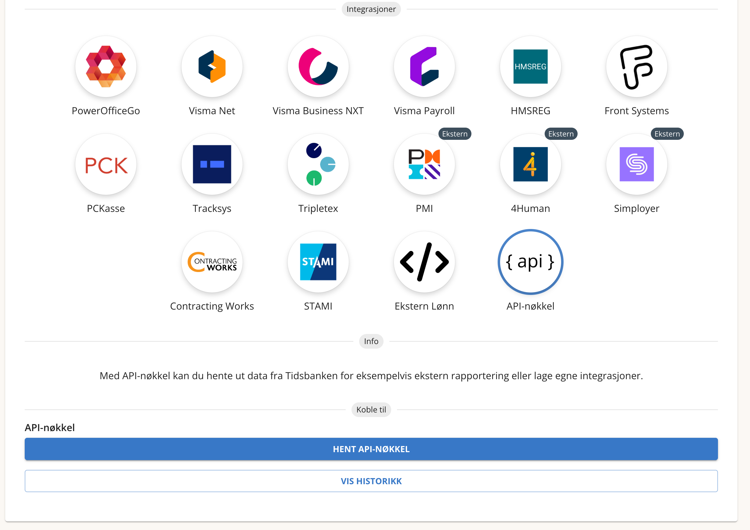 If the API-nøkkel option is not visible, your account may not have an active license for API access. In this case, the feature must be enabled for your environment. Please contact us to order or activate API access.